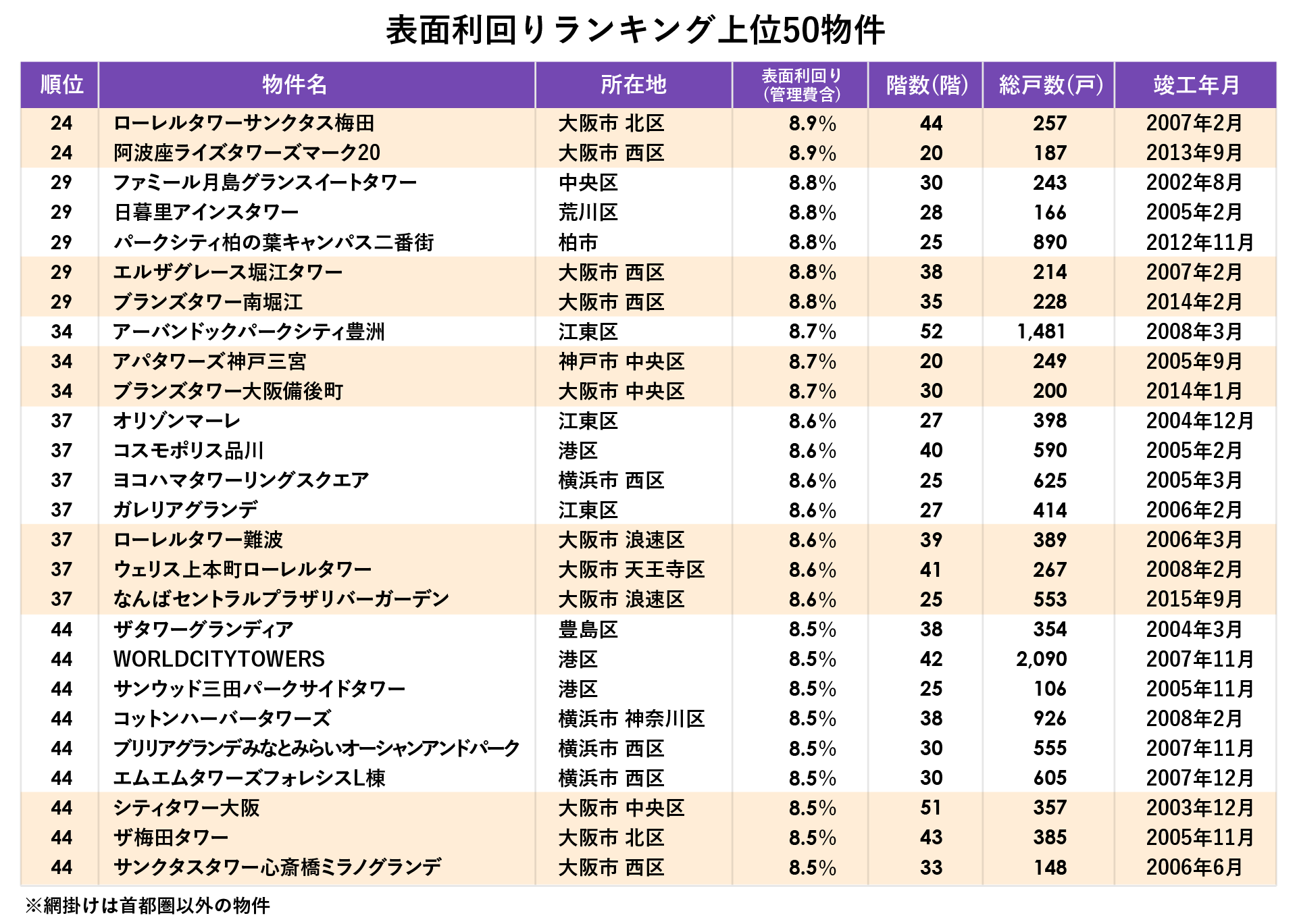 最も表面利回りが高かったのは、江東区の「豊洲シエルタワー」で表面利回り11.5%でした。ランキング上位50物件(同率のため実際は52物件)の中で表面利回りが10%を超えたのは6物件、9%台が17物件、8%台が29物件あり、上位の物件は総じて高い利回りになりました。