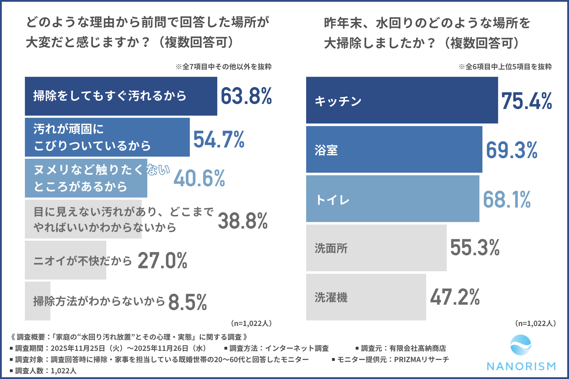 「浴室」「キッチン」「トイレ」といった生活の中心となる場所ほど掃除をするのが大変だと感じており、掃除をしてもすぐに汚れることへの“報われなさ”が負担感を強めています。