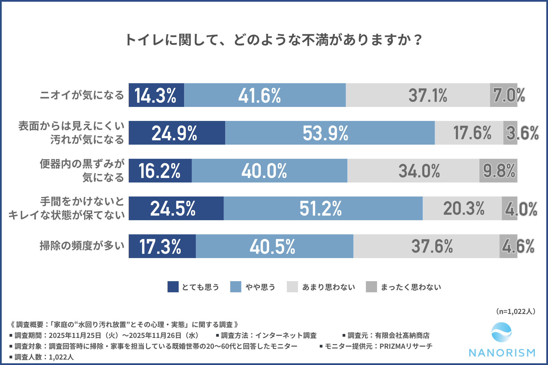 最後に、「トイレに関する不満」を尋ねました。「表面からは見えにくい汚れが気になる」という方が、『とても思う』『やや思う』を合わせて約8割と最多になりました。