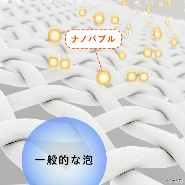 ナノバブルは、「洗剤の洗浄成分(界面活性剤)の効果を高めるチカラ」と、「繊維の奥にしっかり浸透して、汚れを落としやすくするチカラ」があると言われています。