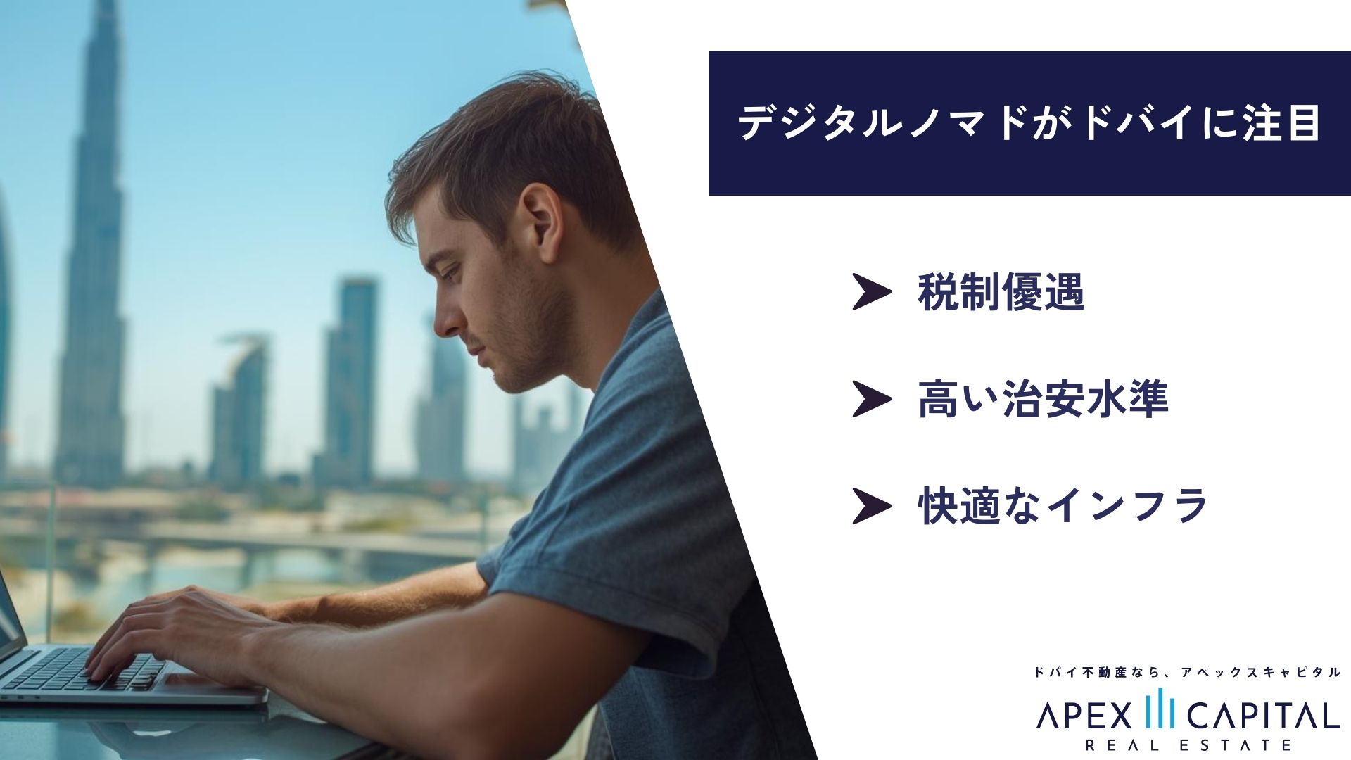 近年、ドバイは税制優遇や高い治安水準、快適なインフラが評価され、世界中のデジタルノマドから注目されています。こうした中で、アペックスキャピタルは現地の最新情報をよりリアルにわかりやすくお伝えするため、ドバイの物件情報をご紹介するPR動画を企画いたしました。