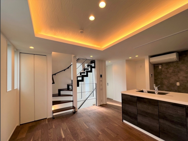 天井を一段折り上げて高さを出すことで、平らな天井と比べて立体的な形状になり、空間に奥行きと広がりを感じることができます。アクセントクロス、照明と組み合わせることでも、多彩に空間を彩りつつ広がりを持たせます。