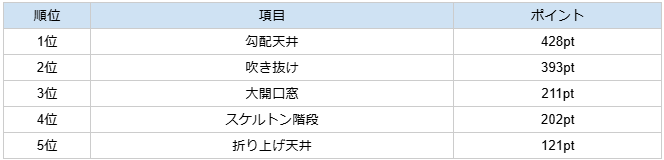 勾配天井や吹き抜けが上位にランクインしたことから、室内の気積を増やす物理的効果と、開放感をもたらす心理的効果の双方に優れるこれらの設計が、設計のプロフェッショナルにとって、コンパクト住宅を広く感じさせるための最も効果的な空間活用術であり、特に「垂直方向の空間の広がり」と「光量を意識した設計」が重視されていることが分かりました。