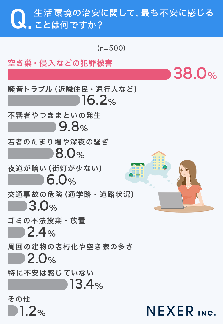 次いで「騒音トラブル」や「不審者」といった日常的なストレス要因も高い割合を占め、生活の平穏も重視されていることが分かります。