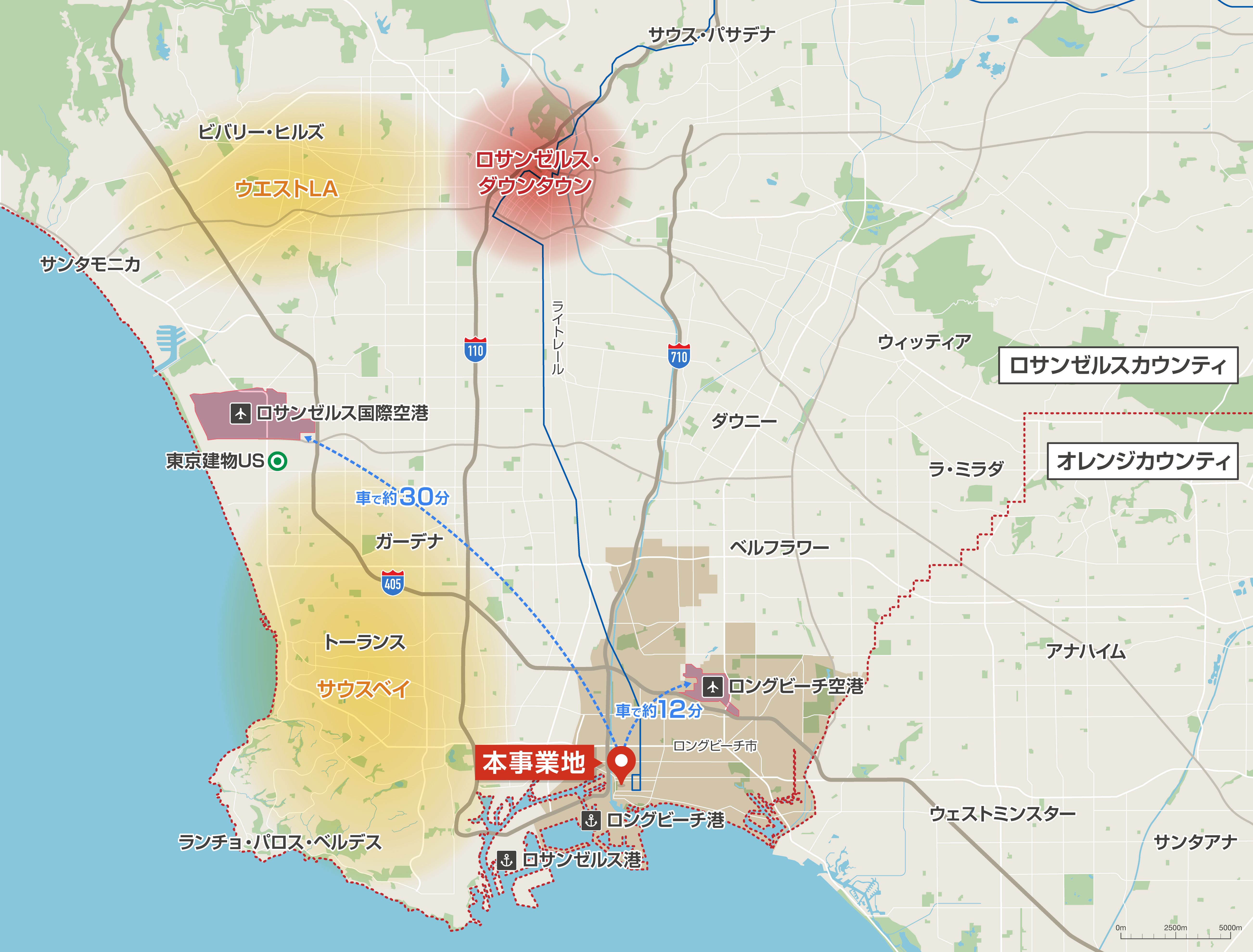 本物件が立地するロングビーチ市は、ロサンゼルス都市圏の南部に位置し、交通利便性と生活の快適性を兼ね備えた都市です。本物件は、主要高速道路710号線・405号線に近接し、ロサンゼルス国際空港へは車で約30分、国内線の拠点であるロングビーチ空港へは約12分でアクセスが可能です。さらに、本物件徒歩約3分の5th St駅よりロサンゼルス市中心部へは鉄道(ライトレール)が直通し、ロサンゼルス市中心部や周辺都市へもスムーズに移動することができます。また、オレンジカウンティ、サウスベイの産業エリアなど雇用集積地へのアクセス性も高いエリアです。