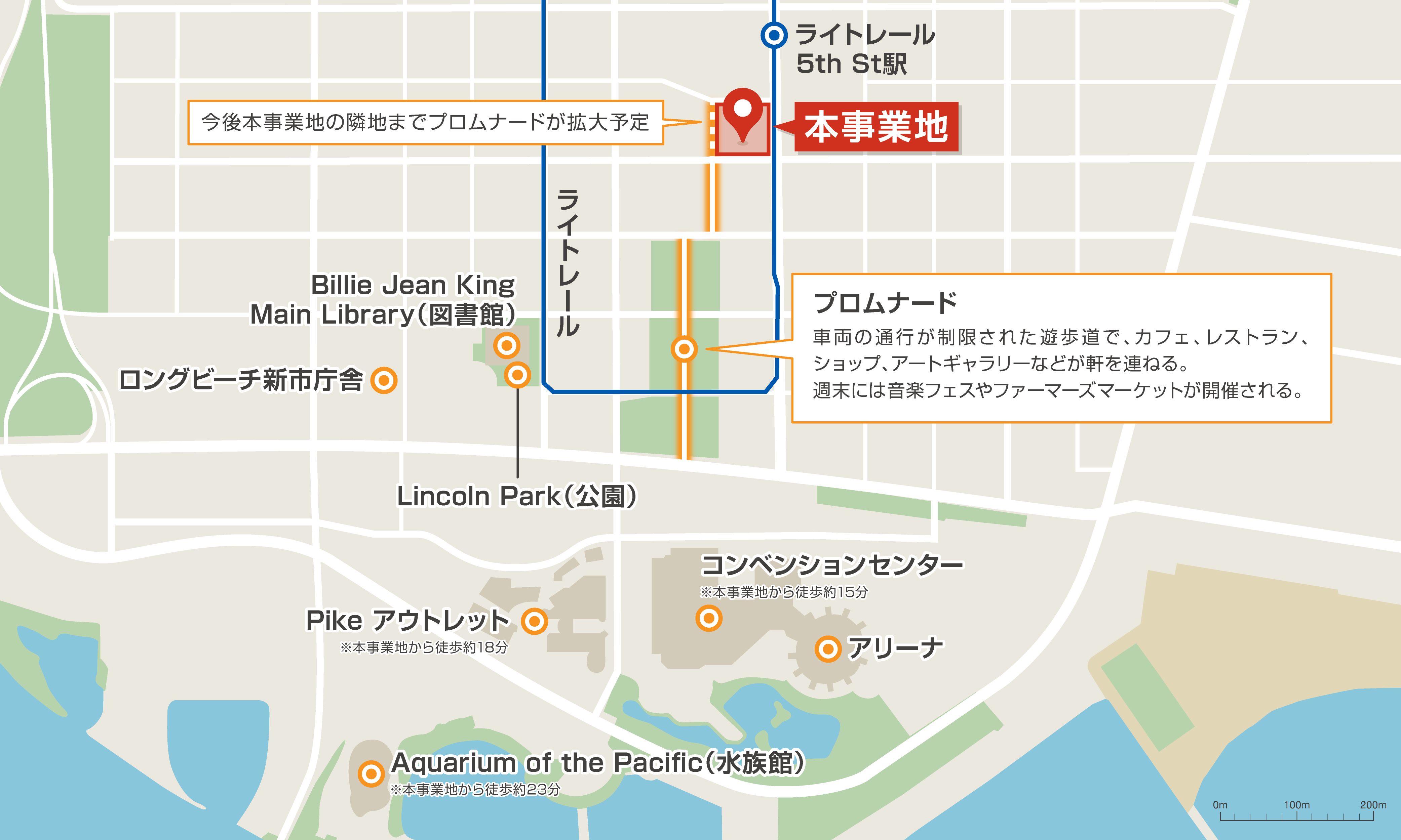 市内中心部には飲食店や商業施設が並ぶプロムナードが整備され、ウォーカブルな環境が広がっています。近年、ロングビーチ市は数億ドル規模の再開発を進めており、その中心には人気観光スポットであるロングビーチ水族館(Aquarium of the Pacific)などを核としたウォーターフロント開発があります。また2019年には新市庁舎が竣工し、2022年には図書館、公園(Lincoln Park)を含む再開発が完了しています。今後も商業施設、住宅、交通インフラの整備が計画されており、雇用増加と経済成長が期待できるエリアです。