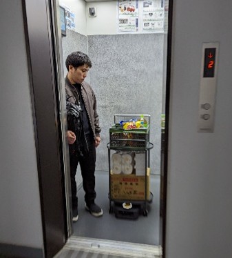 エレベーター移動において、人との同乗を可能とする環境を構築し、居住者の受容性も検証します。