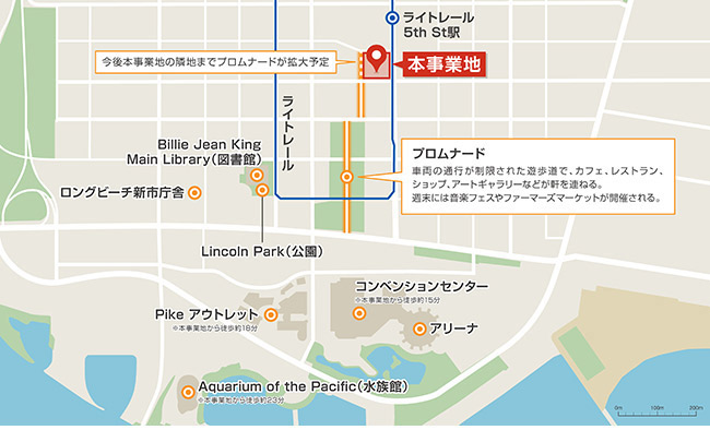 市内中心部には飲食店や商業施設が並ぶプロムナードが整備され、ウォーカブルな環境が広がっています。近年、ロングビーチ市は数億ドル規模の再開発を進めており、その中心には人気観光スポットであるロングビーチ水族館(Aquarium of the Pacific)などを核としたウォーターフロント開発があります。また2019年には新市庁舎が竣工し、2022年には図書館、公園(Lincoln Park)を含む再開発が完了しています。今後も商業施設、住宅、交通インフラの整備が計画されており、雇用増加と経済成長が期待できるエリアです。