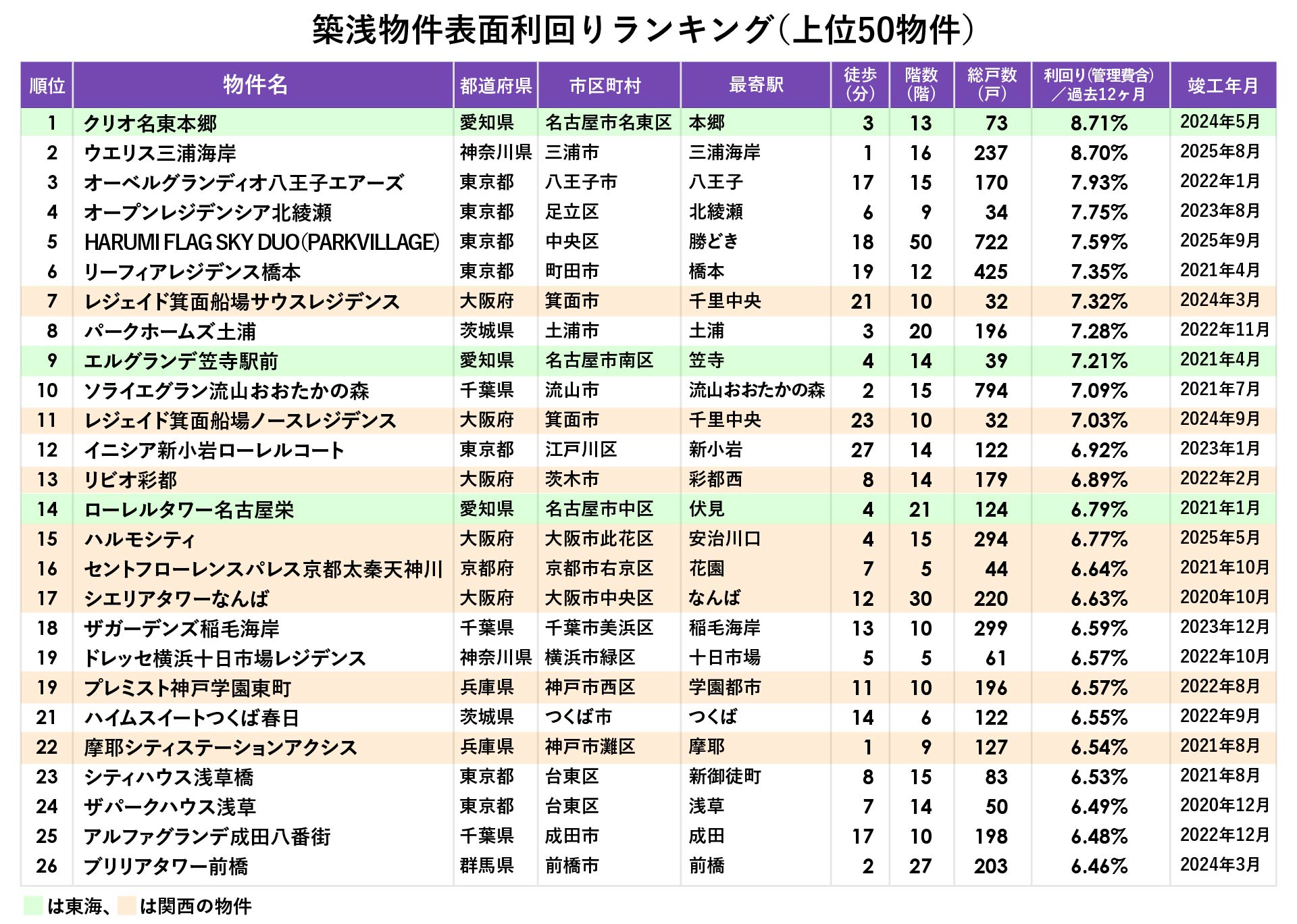 今回は当社のRealnetマンションサマリで算出することができる直近1年間に分譲賃貸マンションとして賃貸流通した部屋の賃料とその部屋の新築時価格から算出される物件毎の平均表面利回りを使い、築5年以内の築浅分譲マンションに限定して、利回りが良い物件順にランキング形式でまとめました。