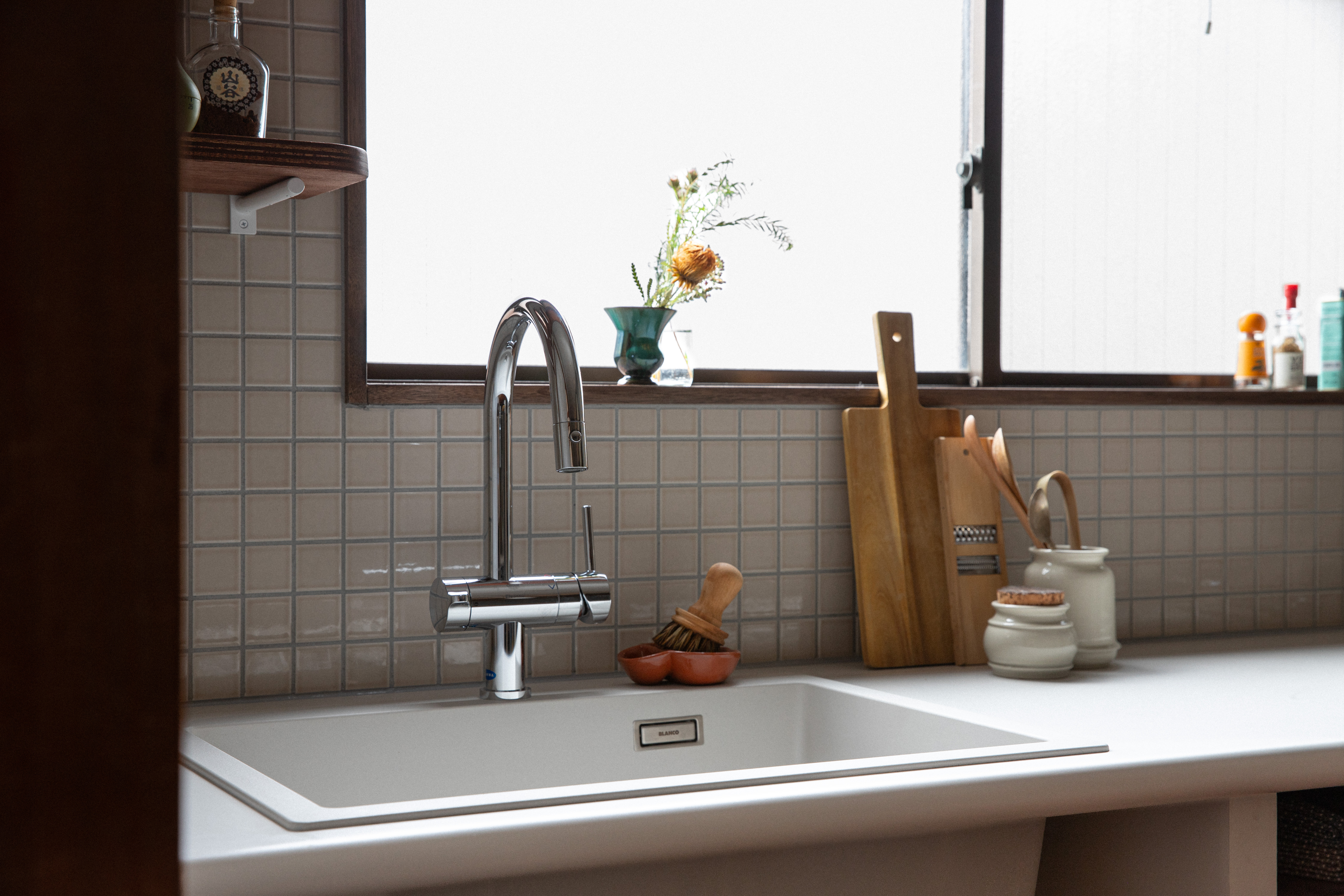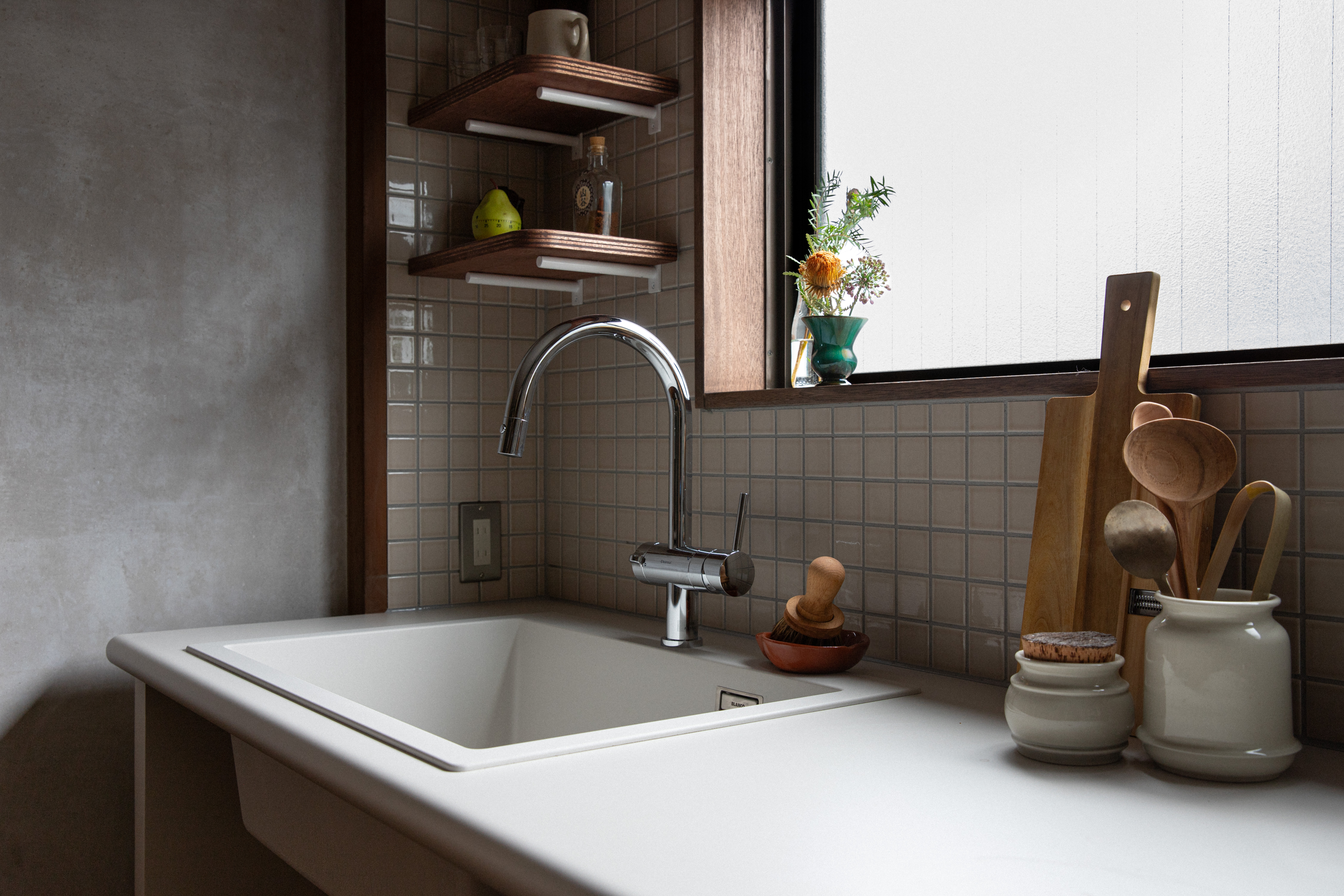 「くすみカラー」は木との相性がよく、周囲のインテリアとの調和も図りやすい色合いです。また、表面は梨地のようなマットな質感で、光を受けてもギラつかず、やわらかく反射します。タイルなど光沢のある素材と合わせても、バランスよくまとまります。