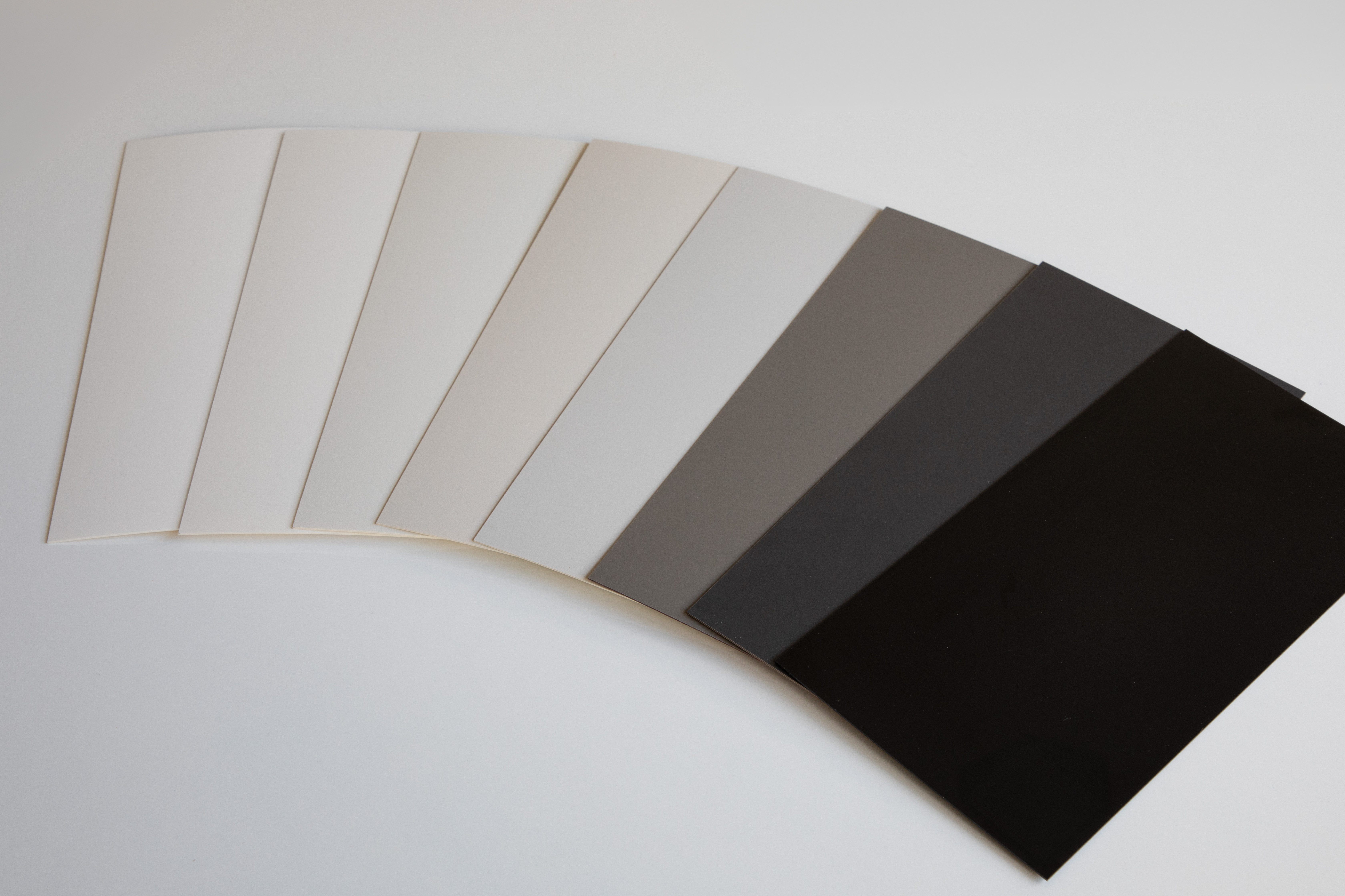 『マットカラーのキッチン天板』は、ホワイト・オフホワイト・ホワイトベージュ・グレーベージュ・ライトグレー・グレー・ダークグレー・ブラックの全8色展開。ホワイトとブラックの中間色に幅を持たせてラインナップしました。