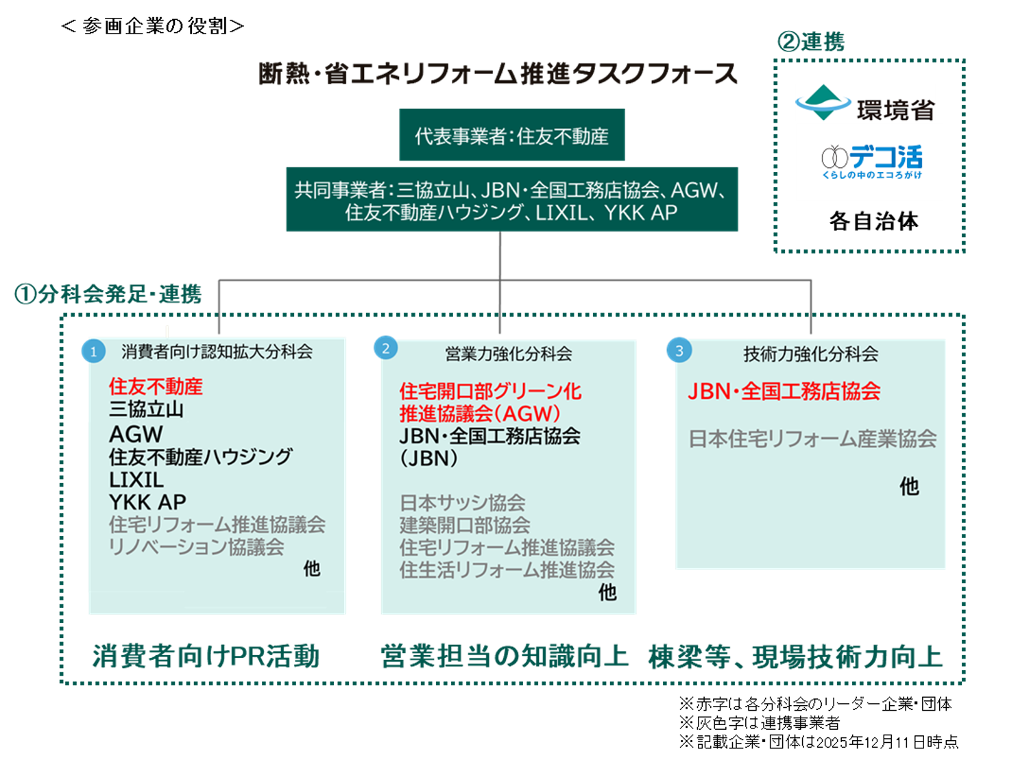 断熱・省エネリフォーム推進タスクフォース(以下「本TF」)は、住友不動産株式会社を代表事業者とし、三協立山株式会社、JBN・全国工務店協会、住宅開口部グリーン化推進協議会(AGW)、住友不動産ハウジング株式会社、株式会社LIXIL、YKK AP株式会社と連携して発足した、既存住宅の断熱・省エネリフォーム普及を目指す団体です。