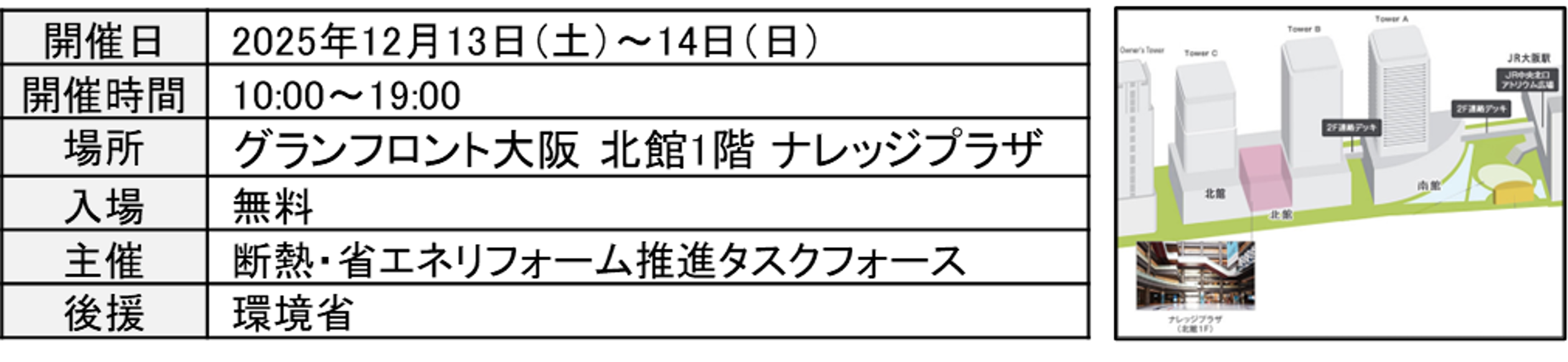 このイベントが、12月13日(土)~12月14日(日)に、大阪のグランフロント大阪 北館1階 ナレッジプラザに登場します。リフォームや断熱関連のニーズが顕在化していない層、特に戸建て所有者およびファミリー層に向けて、断熱リフォームへの気づきと必要性の理解を促進してもらうための、コンテンツを出展します。