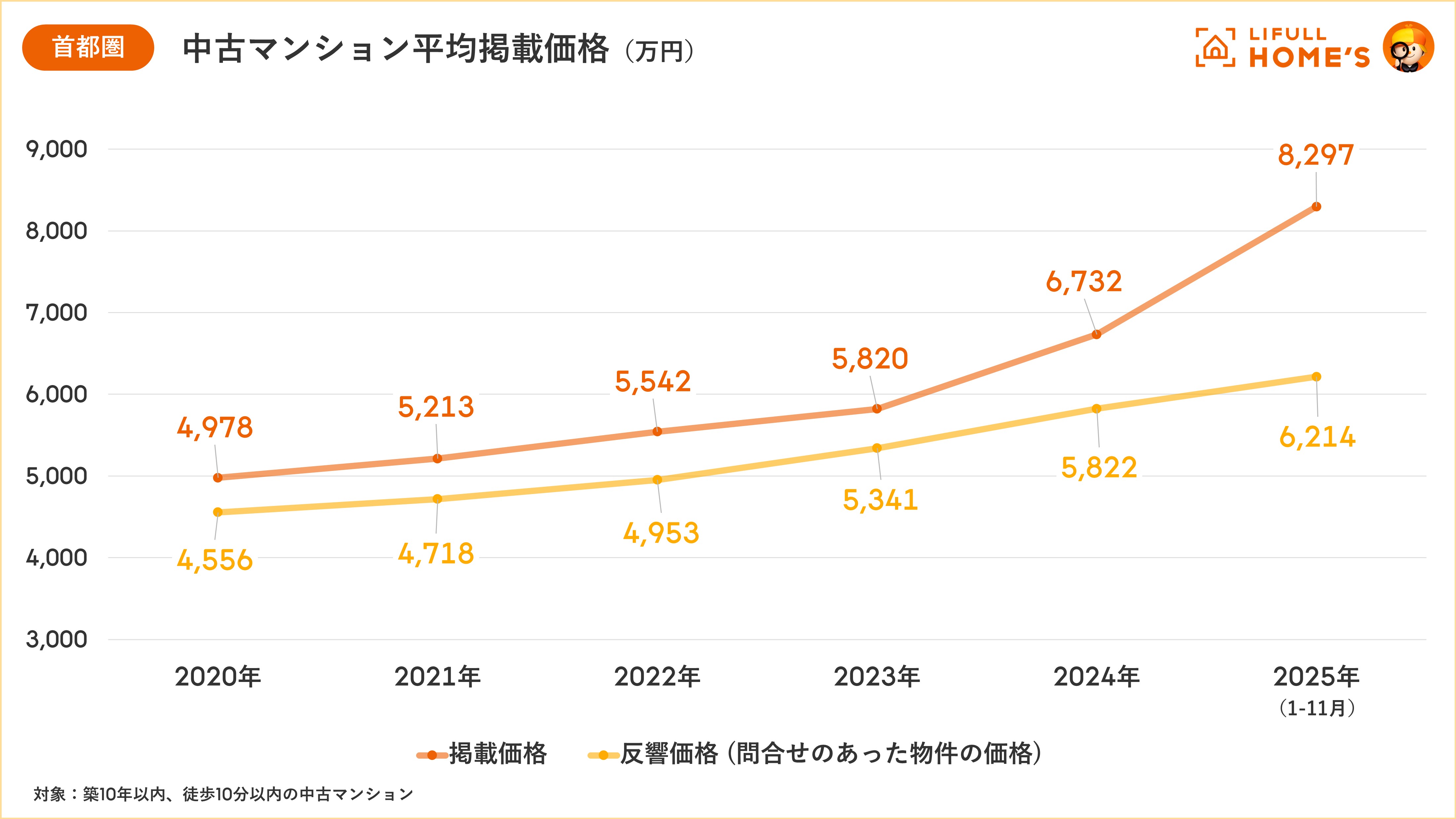 反響専有面積が縮小している要因のひとつとして、住宅価格の高騰があります。首都圏の中古マンション平均掲載価格は2020年から2025年(1-11月)にかけて66.7%(+3,319万円)上昇しています。前年比でも23.2%(+1,565万円)と急上昇しています。一方、反響価格は6,214万円で対前年比も6.7%(+392万円)の上昇に留まっています。