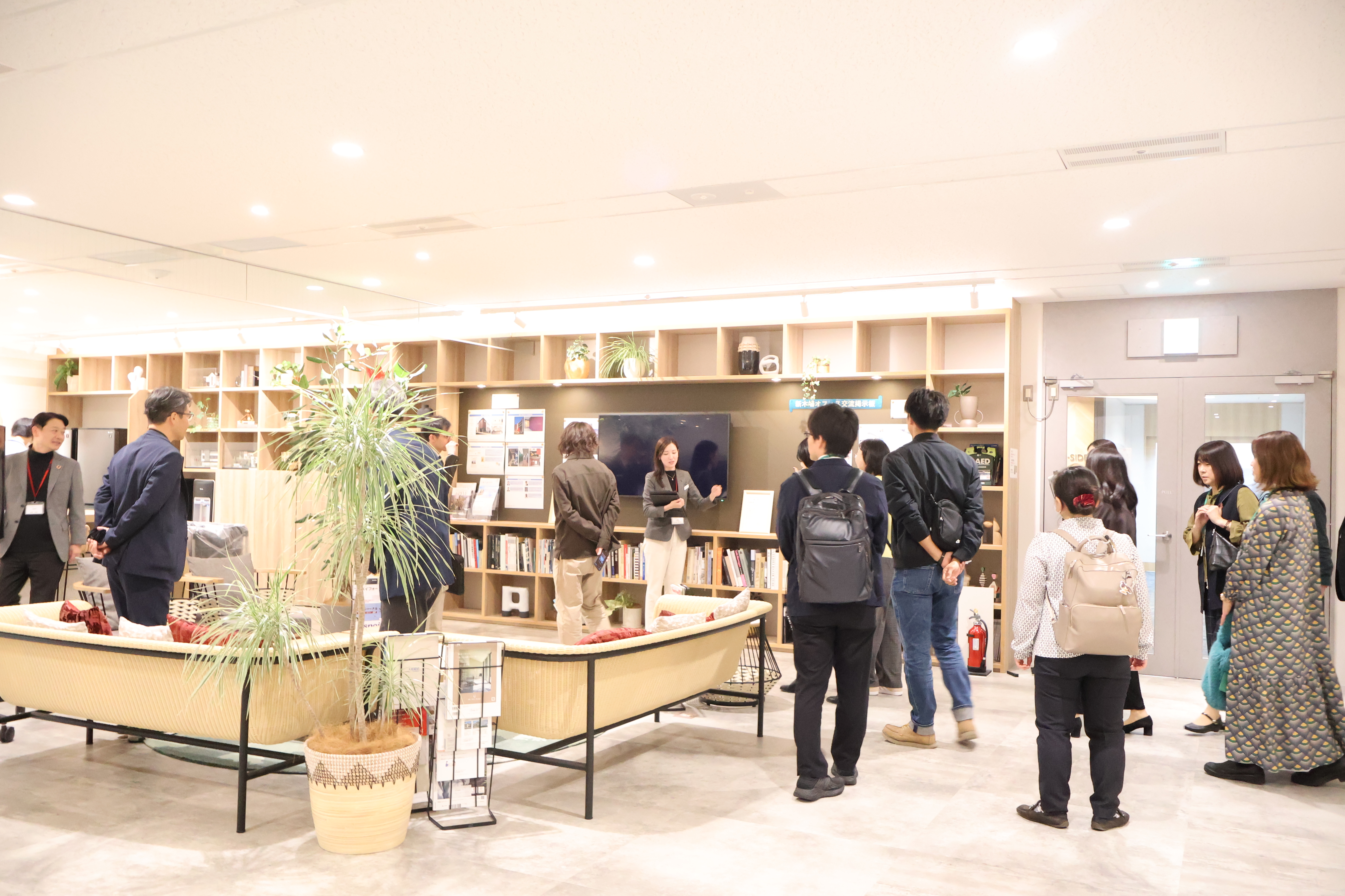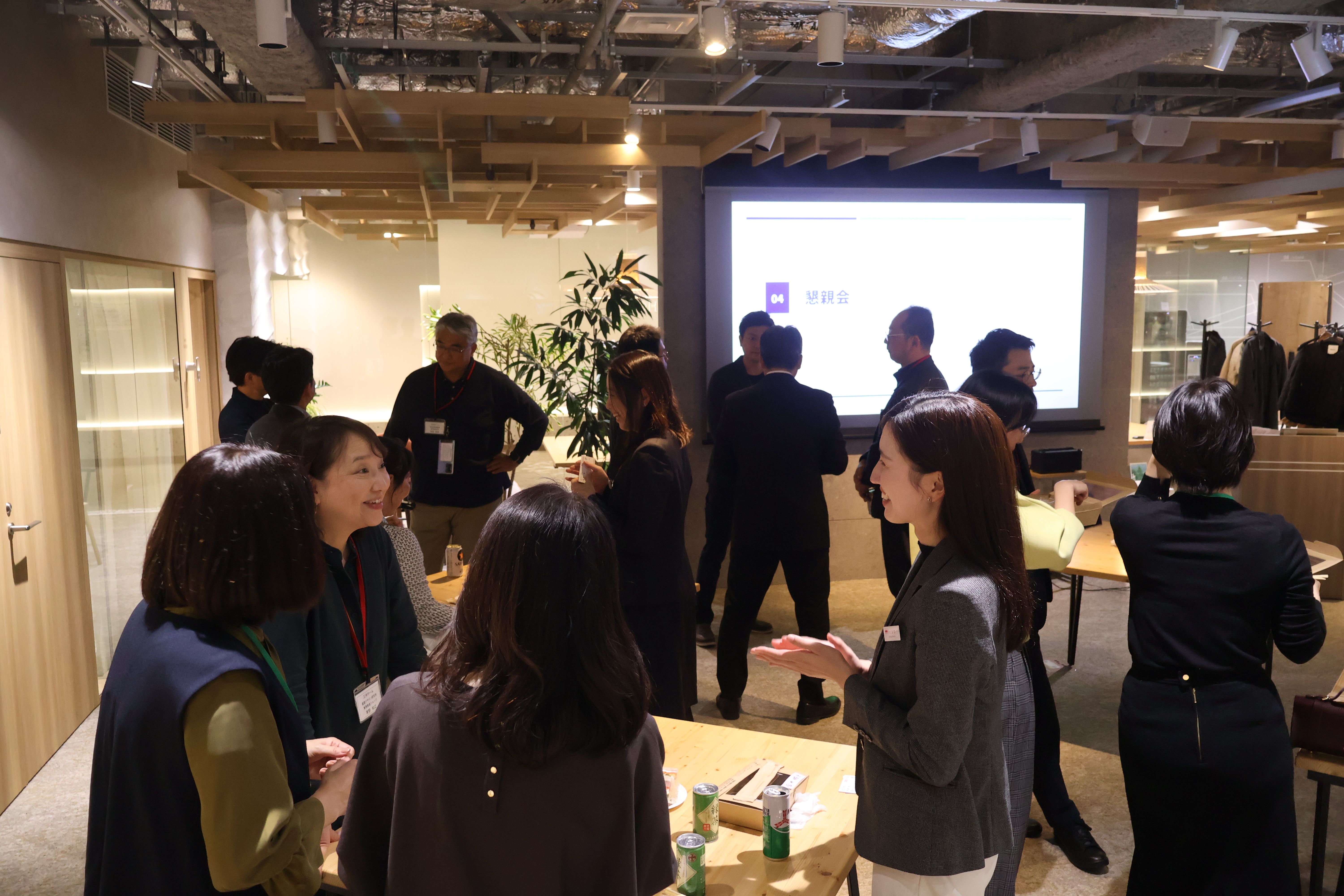 当社は、参加者へ新しい働き方であるABWを体現する新木場オフィスのツアーを実施し、主に10階の職場スペースを案内しました。その後、立食形式の懇親会を開催することで、現役社員とアルムナイとの活発な交流が生まれました 。閉会時には、三井ホームの新しいコミュニティサイトのご紹介などアルムナイの方々との継続的なつながりを呼びかけました。