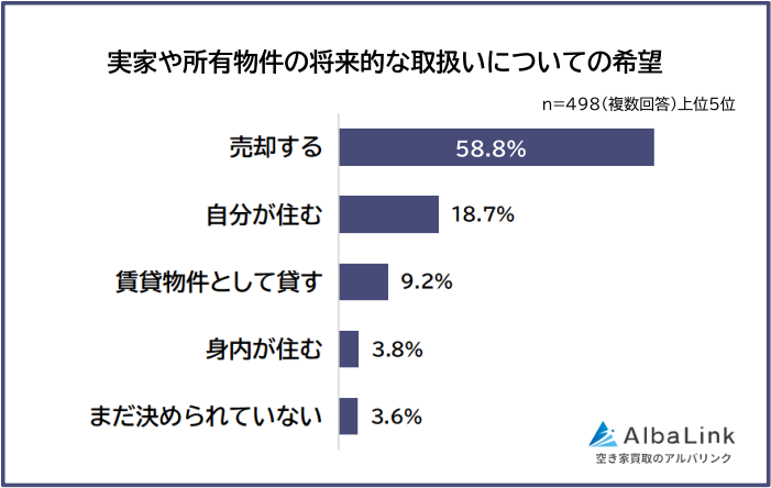 「実家や所有物件の将来的な取扱いについての希望」を聞いたところ、圧倒的1位は「売却する(58.8%)」でした。2位「自分が住む(18.7%)」、3位「賃貸物件として貸す(9.2%)」が続きます。