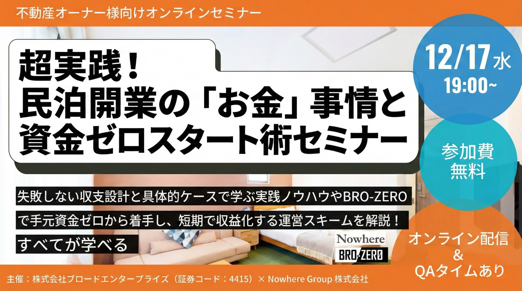 株式会社ブロードエンタープライズ(本社:大阪府大阪市、代表取締役社長:中西 良祐、証券コード:4415、以下、当社)は、Nowhere Group株式会社と共催で、不動産オーナー様向けオンラインセミナーを開催いたします。