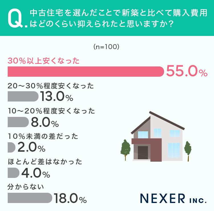 実際に中古住宅を選んだことで新築と比べて購入費用がどのくらい抑えられたと思うかを聞いてみました。