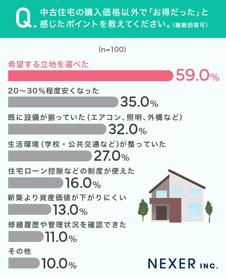■59%が、中古住宅の購入価格以外で「お得だった」と感じたポイントは「希望する立地を選べたこと」と回答