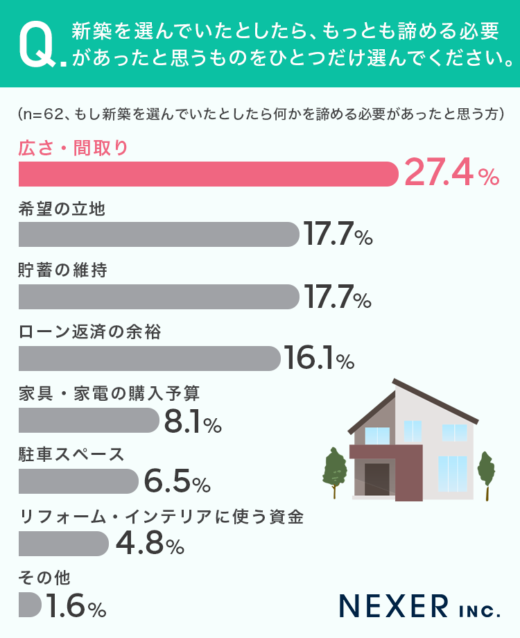 ■27.4%が、新築を選んでいたとしたら、もっとも諦める必要があったと思うものは「広さ・間取り」と回答