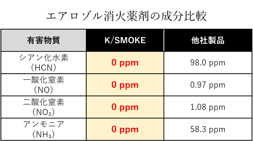 現在消火設備には、消防法で定められたガス系消火設備が多く使用されています。しかし、誤放出による死亡事故、高い環境負荷といった課題が指摘されており、安全性の高い代替技術が求められてきました。その中で、「K/SMOKE GAS」は有害ガスを一切発生させず人体安全性が高いことに加え、地球温暖化係数・オゾン破壊係数もゼロという優れた環境性能、そして高い消火能力を同時に満たす、国内初のエアロゾルガス消火設備として開発されました。