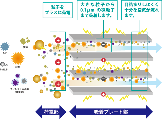 花粉・ウイルス・PM2.5など、汚染物質を電子式集塵フィルタにより0.1㎛以下の微粒子までも除去。