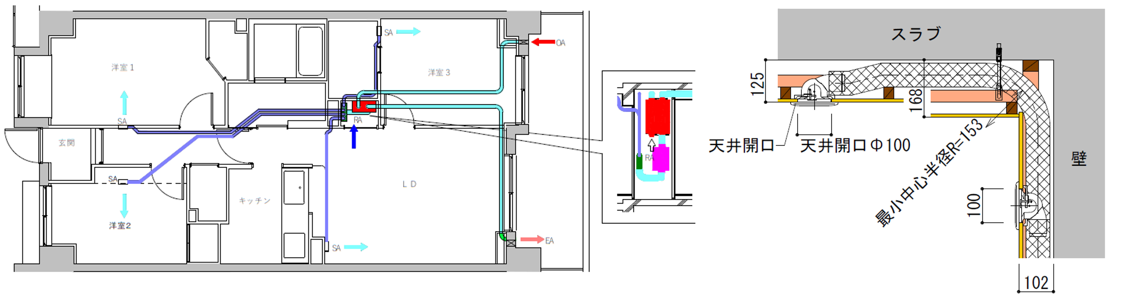 廊下の天井空間や梁ダクト(梁を一部ふかす、梁のように見せる)の活用により配管する例です。