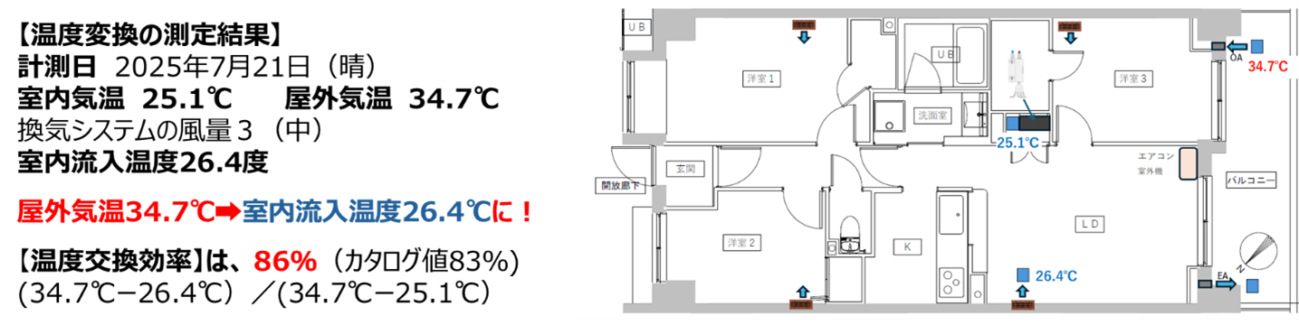夏の外気が34.7℃であるのに屋内に入る新鮮空気の温度は26.4℃と快適な空気質環境となります。