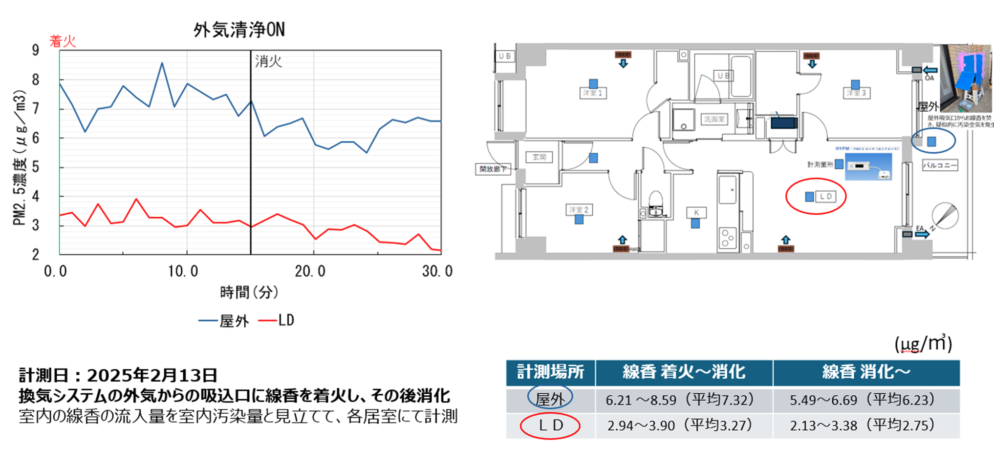 換気システムの外気からの吸込み口に線香を着火し、その後消化。その経過の中で各居室の汚染度の状況を計測しました。外気の汚染度に比べ室内は汚染度が極めて低い事が確認できました。