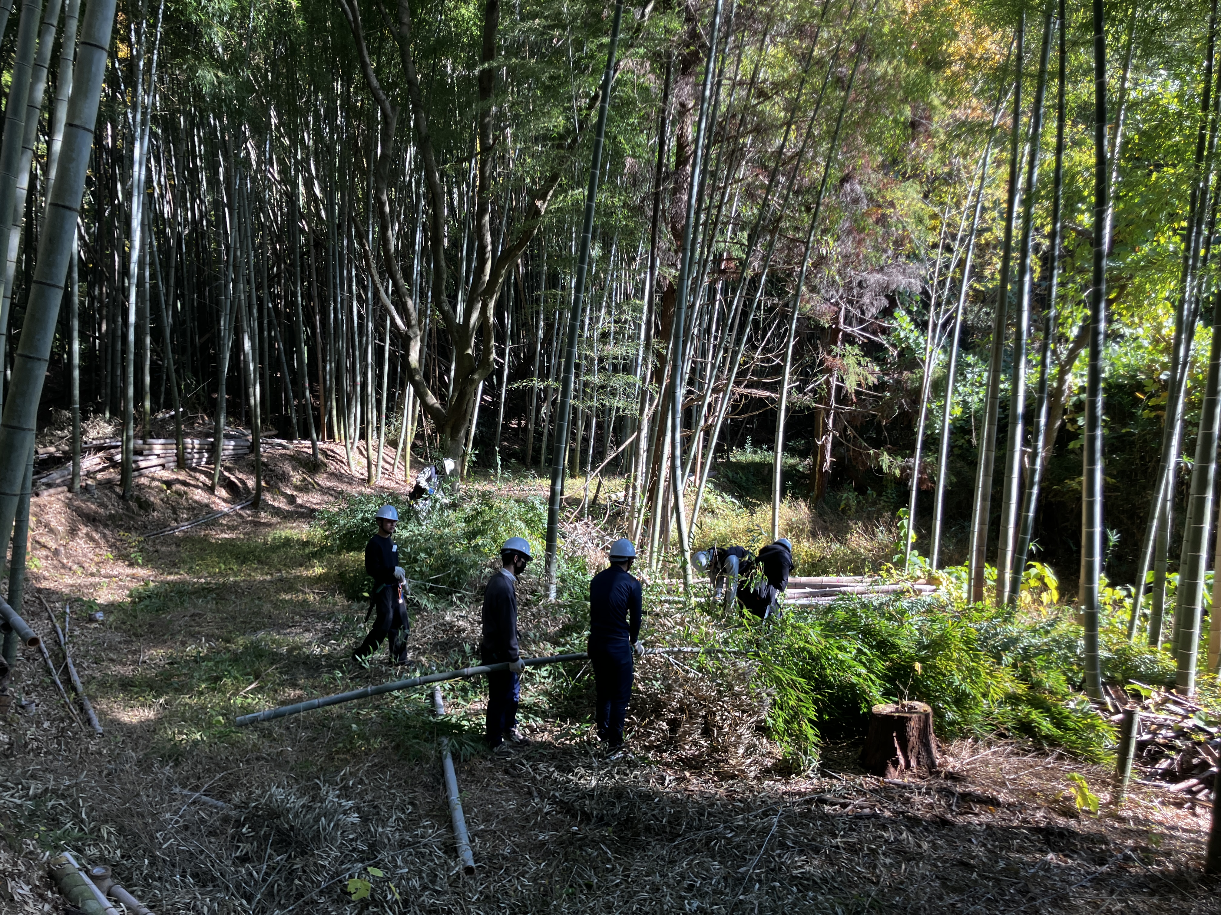 参加者はまず、多井畑西地区の自然の中を歩きながら、竹林が森林環境に与える具体的な影響について学びました。その後、実際にノコギリやナタを使用し、竹の伐採作業に従事しました。また、伐採した竹の一部を無駄無く活用するため「竹筒ごはん」を作り、昼食時に試食しました。自然の恵みを最大限に活かすこの体験は、参加者にとって貴重な学びの機会となりました。解散後には、希望者向けに竹を使ったクラフト体験も提供し、楽しみながら竹材の有効活用について理解を深めました。