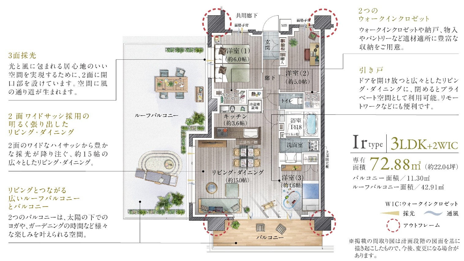 《プラン例》広々としたルーフバルコニーのある3LDK角住戸プラン