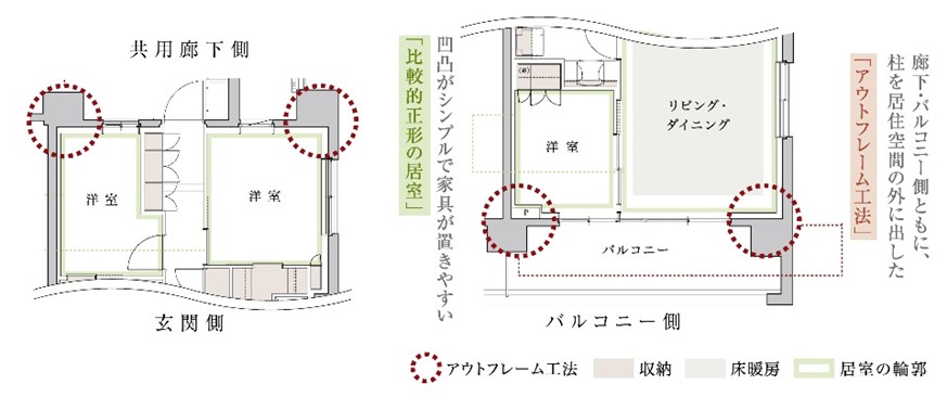 共用廊下側とバルコニー側の両方で柱型を外に出すアウトフレーム工法を採用。居住空間が整形に近くなるため、部屋の隅まで有効に使えます。空間がすっきりとし、面積以上のゆとりを感じられる住空間を実現しました。