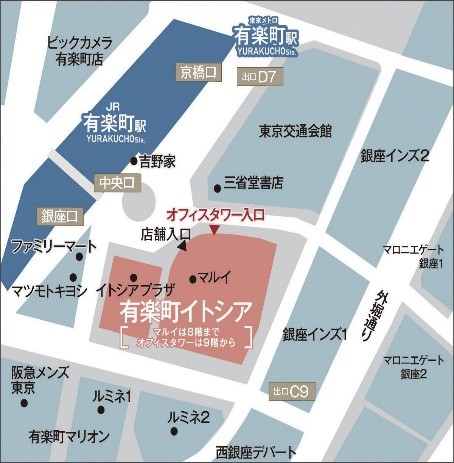 JR山手線「有楽町」駅徒歩1分、東京メトロ有楽町線「有楽町」駅徒歩1分、東京メトロ銀座線・日比谷線・丸ノ内線「銀座」駅徒歩2分 |