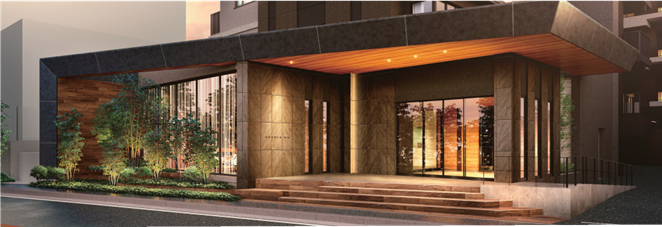 旧川越街道沿いに設えたエントランスは、前庭と一体的なデザインとし、広がりのある庇が、空間の広がりとスケール感を創出します。エントランスや前庭のガラスの向こうに内部が見え隠れする開かれた印象は、かつてこの街道沿いに連なっていた宿場町の街並みをオマージュ。土地の歴史や風情を継承し、モダンで落ち着きある佇まいを演出しました。