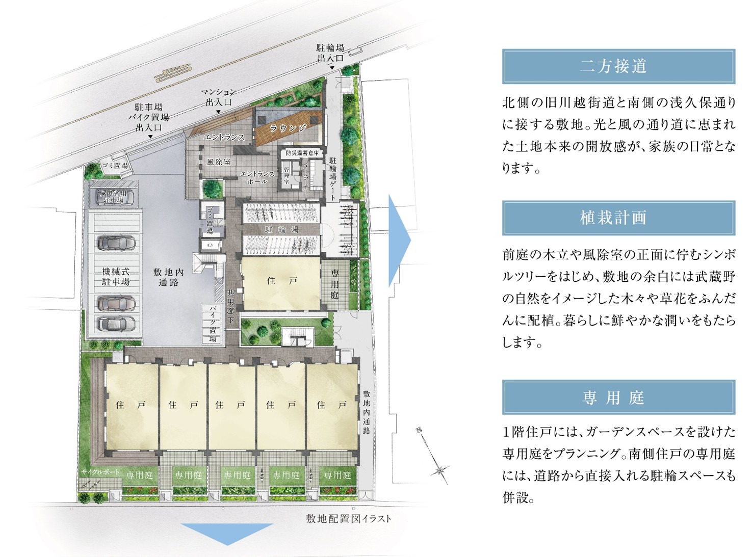 敷地の規模感を生かして、建物は2棟構成で配置し、全ての住戸が南東または南西方向に主開口部とバルコニーを有する開放的なプランを実現しました。共用部は、駅からの動線となる旧川越街道沿いに集約し、利便性と快適性を追求。本物件は、堅固な地盤を誇る武蔵野台地に位置し、周辺には武蔵野の原風景を感じる緑豊かな公園が多いことから、敷地の外周部や中庭には、武蔵野の自然をイメージして多彩な植栽を配しました。