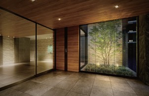 風除室の正面には、シンボルツリーが印象的な坪庭を設け、風除室の左側に配したエントランスホールには、自然素材の風合いが心地いい空間に水の煌めきをイメージしたガラスアートを設置しました。
