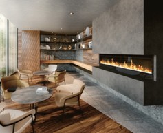前庭の緑とレインシャワーをイメージした窓ガラス、木質感溢れる空間が、森の気分を深めるラウンジ。インテリア暖炉の“燃えない炎”に癒され、一人の時も集いの時も心が休まるサードプレイスです