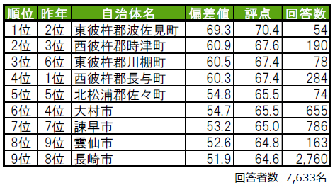 1位は北松浦郡佐々町、2位は西彼杵郡時津町、3位は西彼杵郡長与町で、トップ3は全て郡部に属する「町」で、その内2つは西彼杵郡に属してしています。また、トップ3の自治体は、「住みここち」や「街に愛着がある」でもトップ3となる高い評価を得ています。