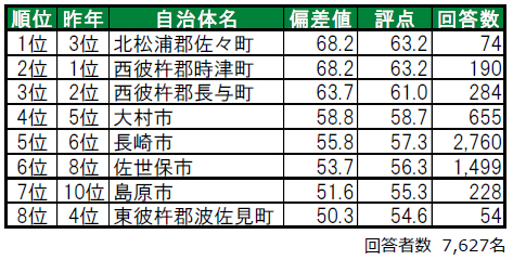 ○北松浦郡佐々町が昨年3位から順位を上げて1位