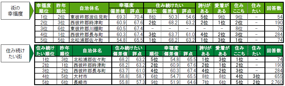 住み続けたい街は、1位北松浦郡佐々町、2位西彼杵郡時津町、3位西彼杵郡長与町。