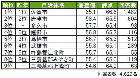 佐賀市が2年連続で1位に輝きました。2位も2年連続で唐津市、3位は昨年は偏差値50未満で順位非公開だった多久市です。トップ9内では、9位に三養基郡上峰町がランクイン、昨年は偏差値50未満で順位非公開だった自治体です。