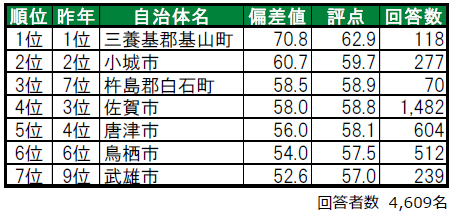 1位は5年連続で三養基郡基山町で、唯一偏差値70台の高い評価を得ています。2位は、3年連続で小城市です。3位は杵島郡白石町で、昨年7位から順位を上げてトップ3入りしています。トップ3の内2つは、郡部に属する「町」という結果になっています。