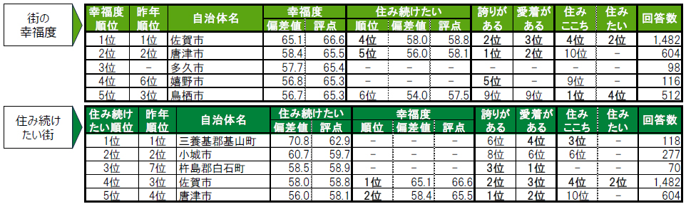 街の幸福度のトップ2は2年連続で、1位佐賀市、2位唐津市。3位多久市。