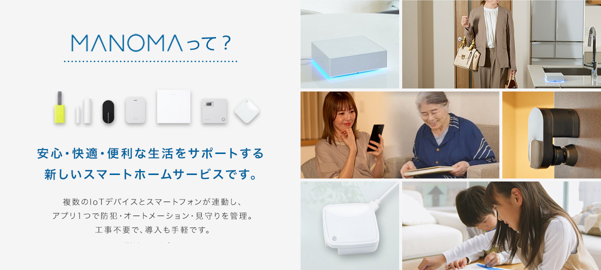 MANOMAは、「セキュリティ」「見守り」「オートメーション」に家事代行などの「家ナカサービス」を加えた、ライフスタイルに新たな体験価値を提供するスマートホームサービスです。複数のIoT機器とスマートフォンを組み合わせることで、お家の便利・安心・快適をサポートします。