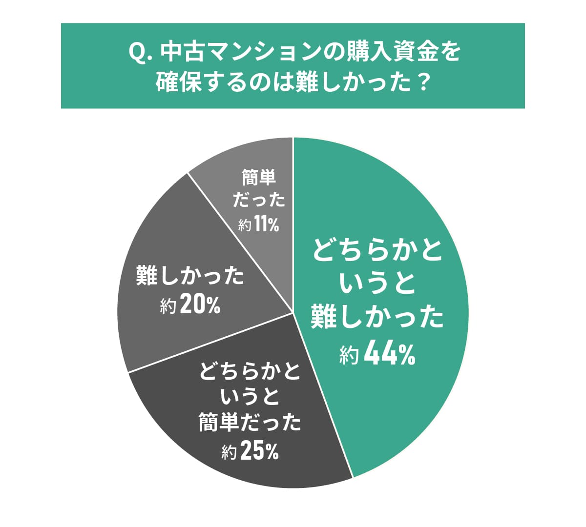 回答者に「中古マンションの購入資金を確保するのは難しかったですか?それとも簡単でしたか?」と質問しました。約64%が「難しかった」「どちらかというと難しかった」と回答しています。資金確保に苦労した人が多数派を占める結果となりました。