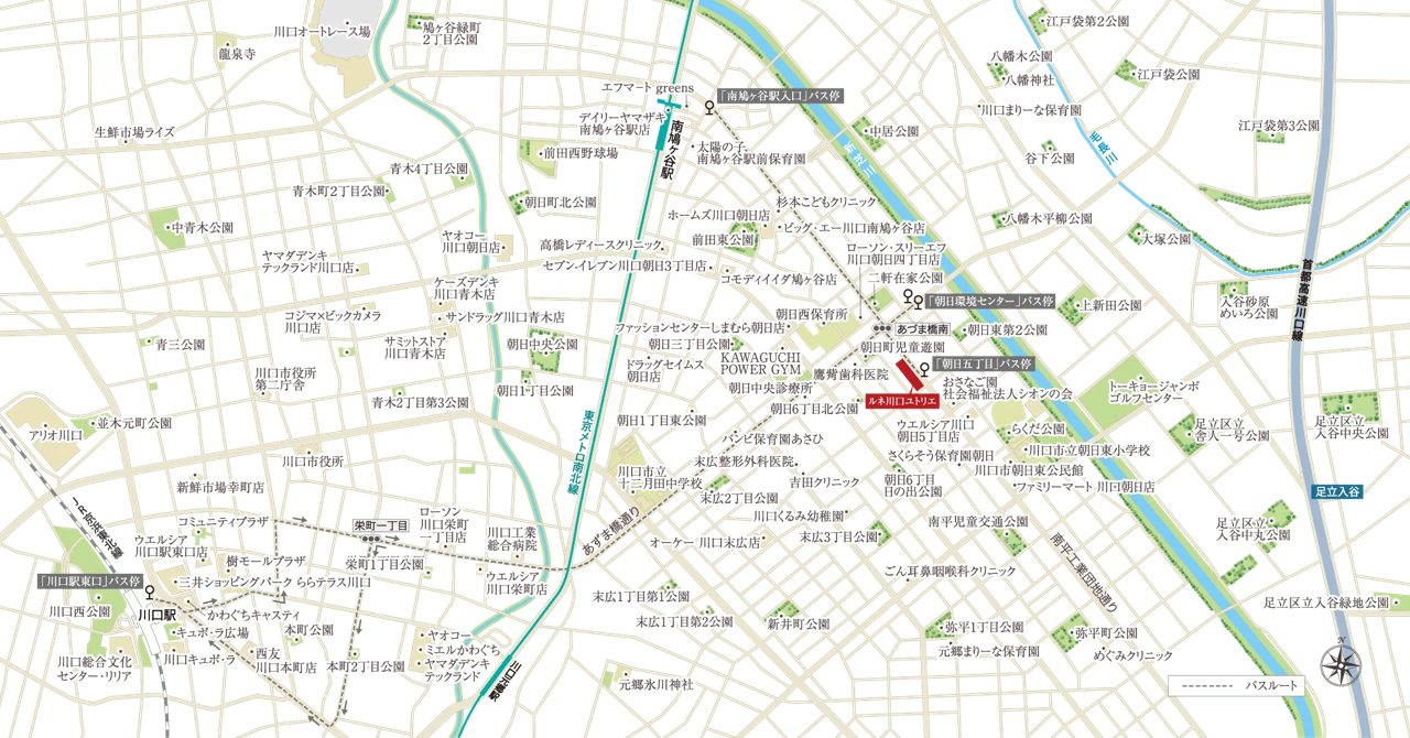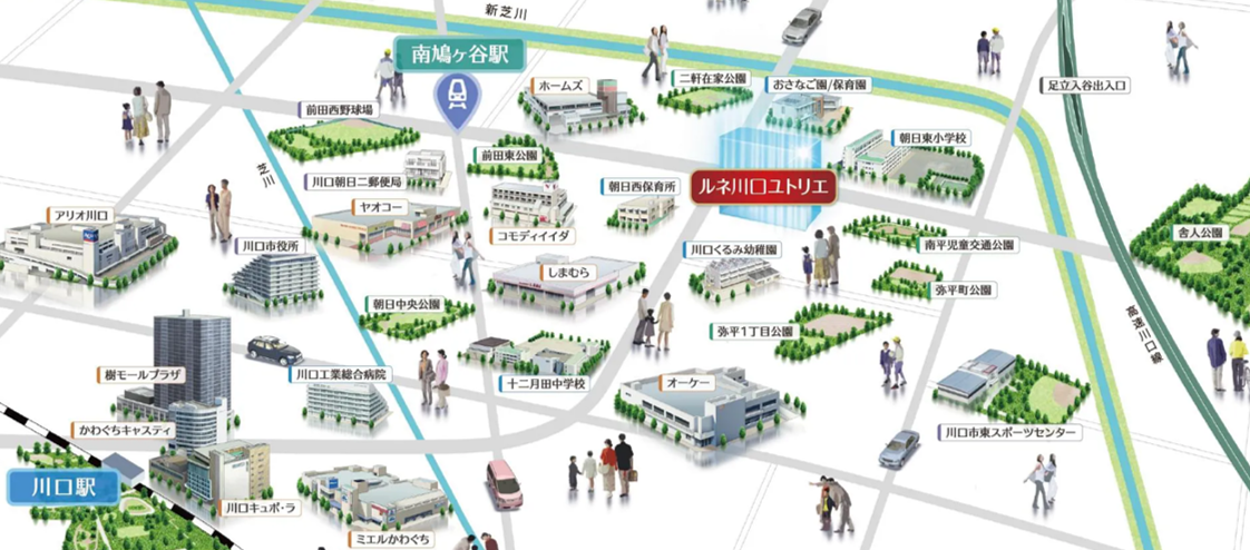 本物件は、「アリオ川口」や「川口キュポ・ラ」まで自転車13分以内でアクセスできます。大型商業施設に加え、「さくらそう保育園朝日」まで徒歩6分、「南平児童交通公園」まで徒歩9分と教育施設や公園も身近に揃い、子育てと仕事を両立できる環境です。