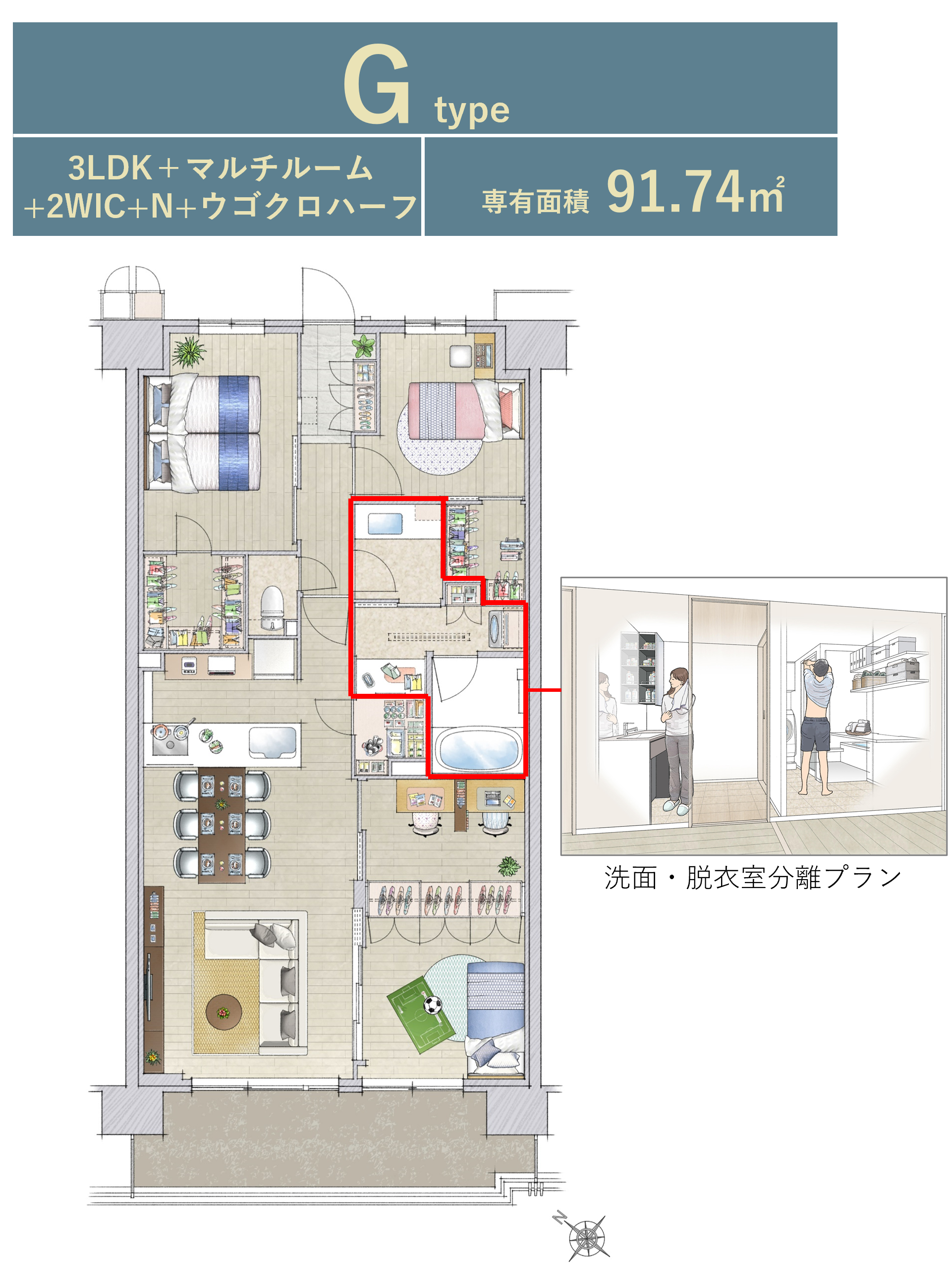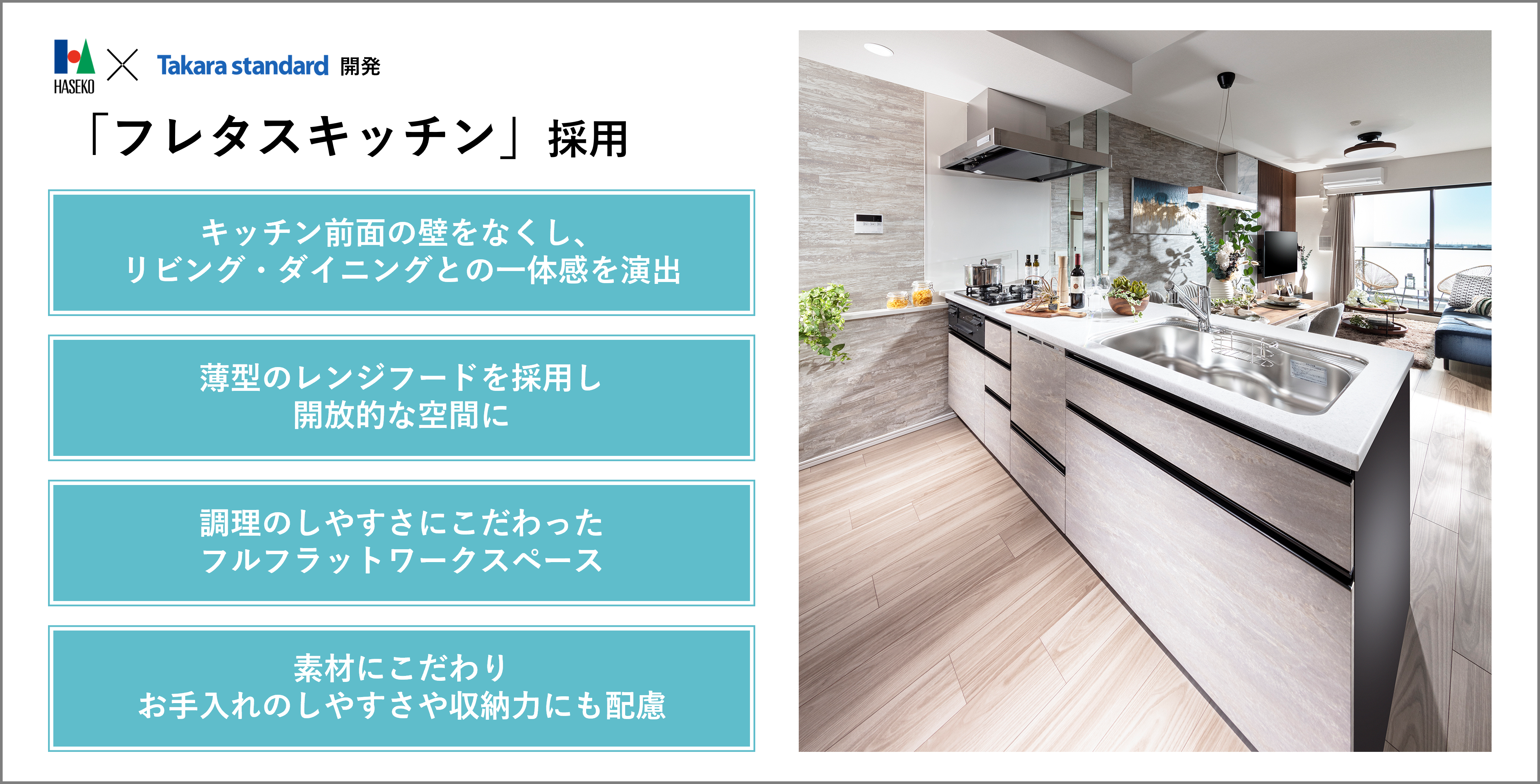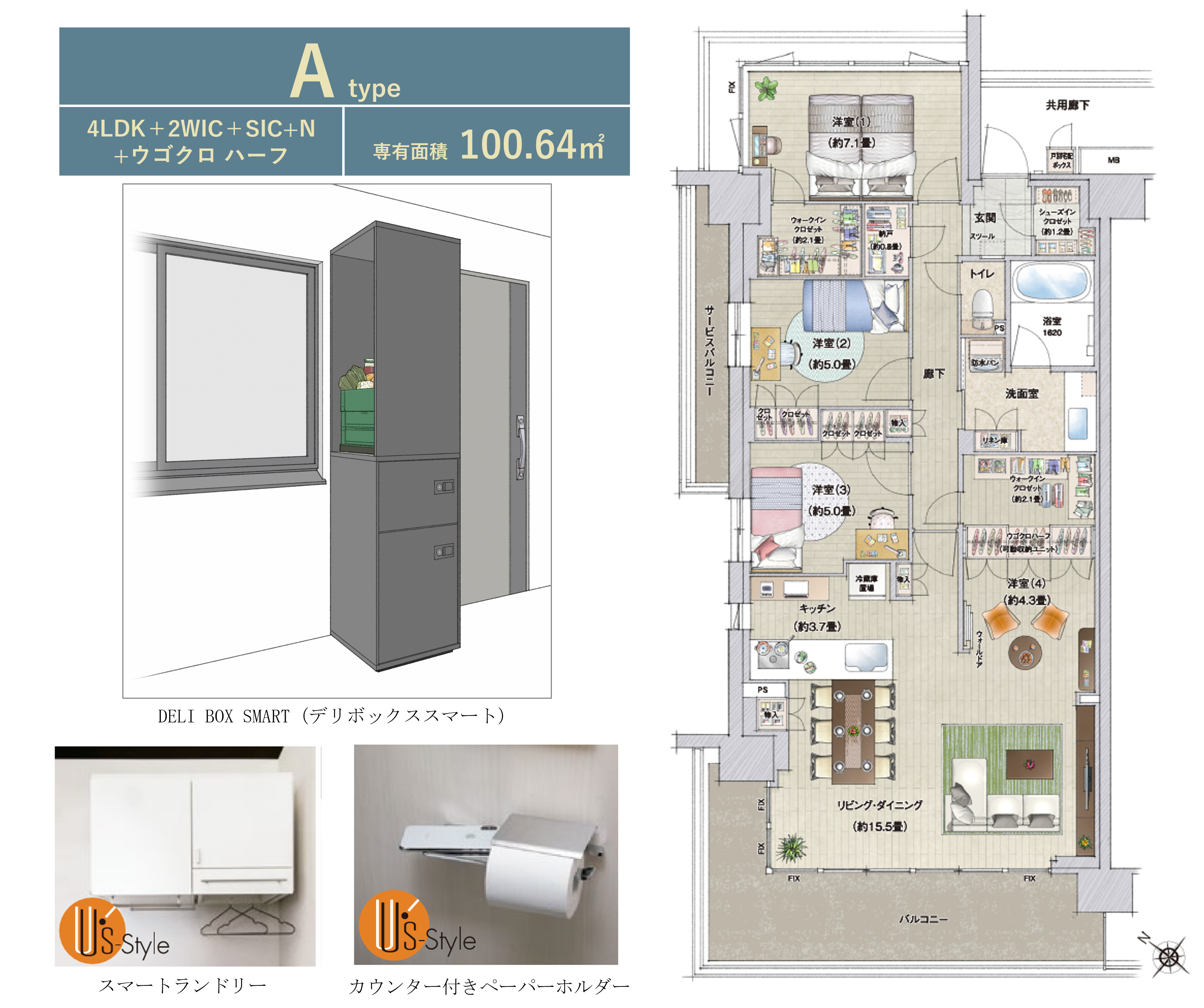 本物件では2LDK 73.11㎡~4LDK 100.64㎡まで全10タイプのプランバリエーションをご用意し、玄関横には宅配業者が伝票番号を解除キーとして荷物を届ける「DELI BOX SMART」を全住戸に採用しております。専有部では、長谷工アーベストの女性スタッフを中心に「あったらいいな」をカタチにしたオリジナル仕様「U‘S Style(ユーズスタイル)」から、「スマートランドリー」、「カウンター付きペーパーホルダー」等を採用しました。キッチンには長谷工コーポレーションとタカラスタンダードが共同開発した新発想の「フレタスキッチン」を設置しました。また、シューズインクロゼット(SIC)から直接洗面室に行けるSICダイレクト洗面室プランや家族の動線に配慮した洗面・脱衣室分離プラン、アウトドア用品を置ける土間プラン、キッチンスペースを広く確保したキッチンアトリエプランなど個性豊かな間取りプランをご用意しました。