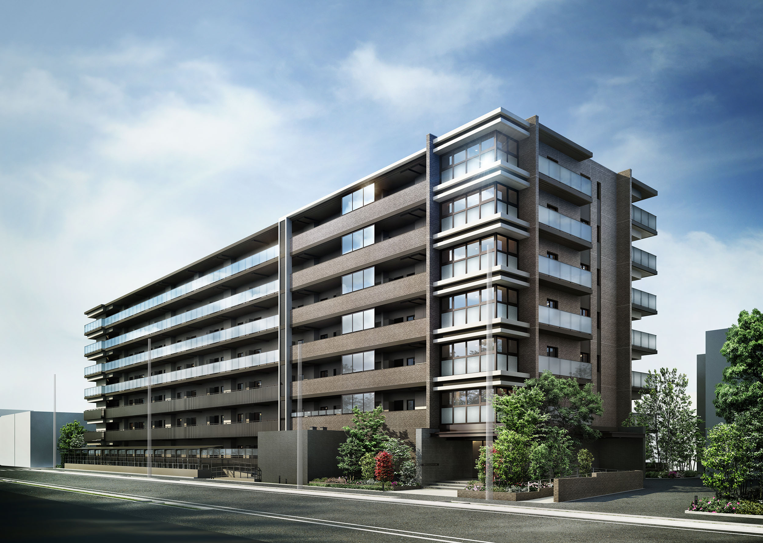※掲載の完成予想CGは設計図書を基に描き起こしたもので、実際とは多少異なる場合がございます。外観の細部・設備機器・配管類及び電柱・架線・道路標識・周辺建物等は一部省略または簡略化しております。植栽は、実際に植樹する樹形、枝ぶり、葉や色合いとは異なる場合があり、特定の季節の状況を示すものではありません。また、竣工時には完成予想CG程度には成長しておりません。タイルや各部材等につきましては、実際と質感・色等の見え方が異なる可能性があり、今後変更になる場合があります。