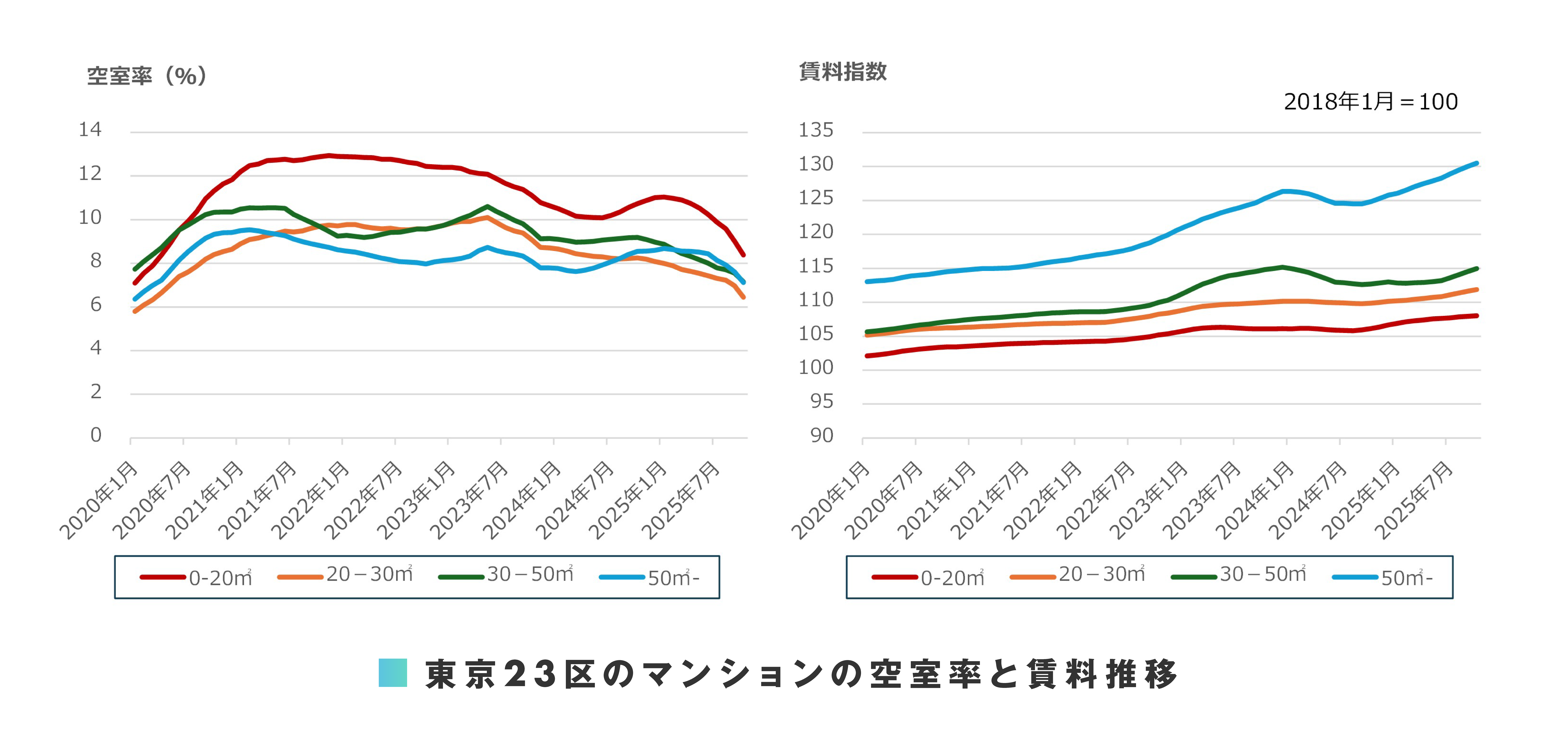 東京23区ではアパート・マンション共にすべての面積帯で空室率が改善しました。募集賃料の上昇は継続していますが、マンションの家族向け(50㎡-)を除き、平均支払い賃料(以下、支払い賃料)の上昇は伸び悩んでいます。東京23区の2025年10月の消費者物価指数は前年同月比+2.8%でしたが、アパートの支払い家賃の年間上昇率は0-20㎡が+0.39%、20-30㎡が+0.55%、30-50㎡が+0.34%と、消費者物価上昇率に比較して低い水準にとどまっています。50㎡-は▲0.47%と、逆に下落しています。マンションの支払い家賃の年間上昇率はアパートよりも高く、0-20㎡が+1.79%、20-30㎡が+1.82%、30-50㎡が+1.99%、50㎡-は+4.55%であり、50㎡-は消費者物価指数の上昇率を上回っていますが、その他の面積帯の上昇率は消費者物価指数の上昇率を下回っています。