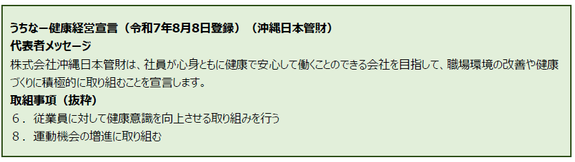 沖縄日本管財は、これからも、社員が心身ともに健康で安心して働くことのできる会社を目指し、職場環境の改善や健康づくりに取り組んでまいります。
